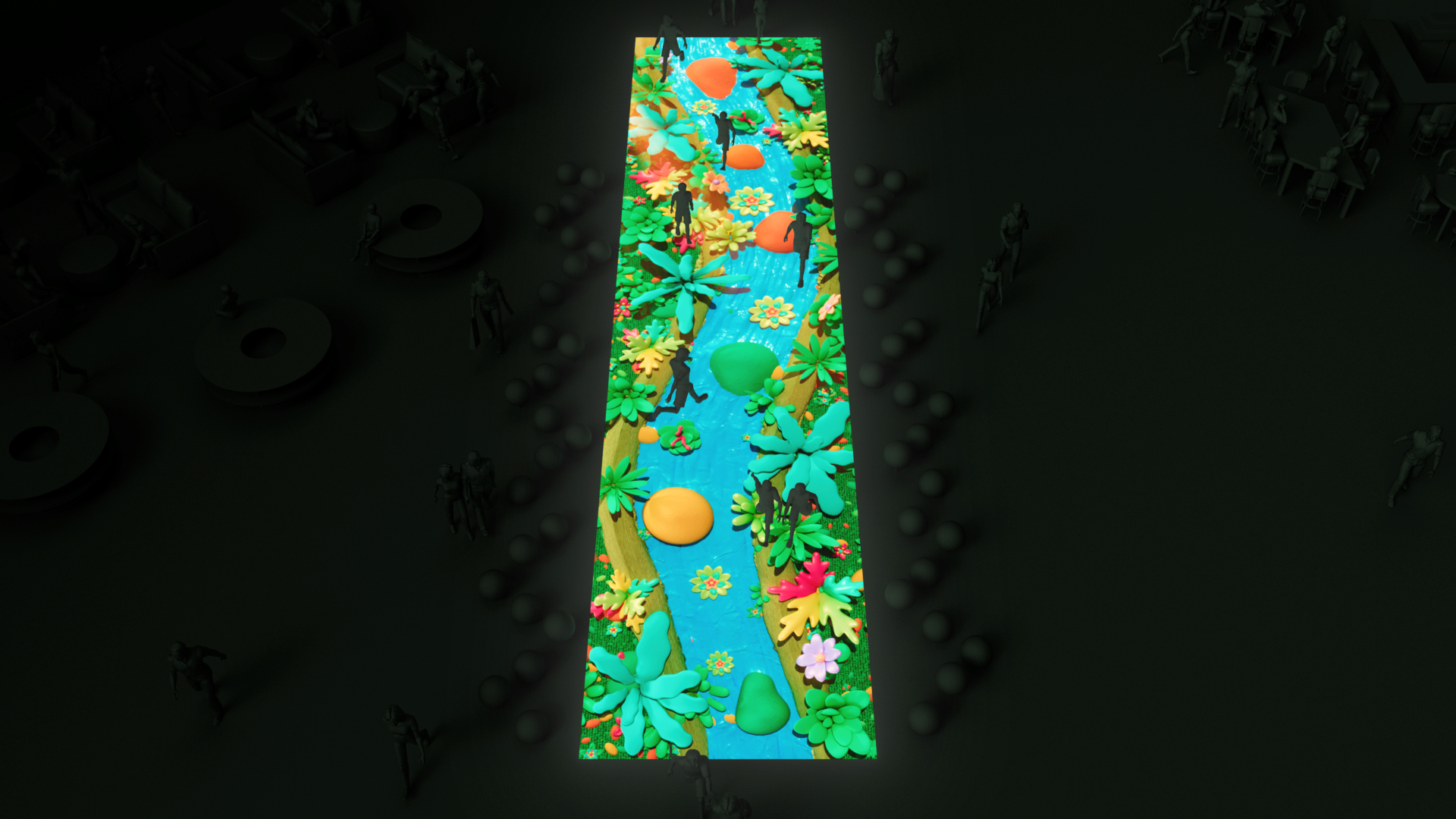 Why choose this solution over analog alternatives? The interactive game floor brings digital interactivity, dynamic content and configurable gameplay mechanics that traditional playground equipment cannot replicate. The installation is compact, configurable and designed for easy operation by venue staff. It is designed for single-player use, while still offering competitive and cooperative game modes through score challenges, content variations, and quick thematic changes to encourage repeat visits.