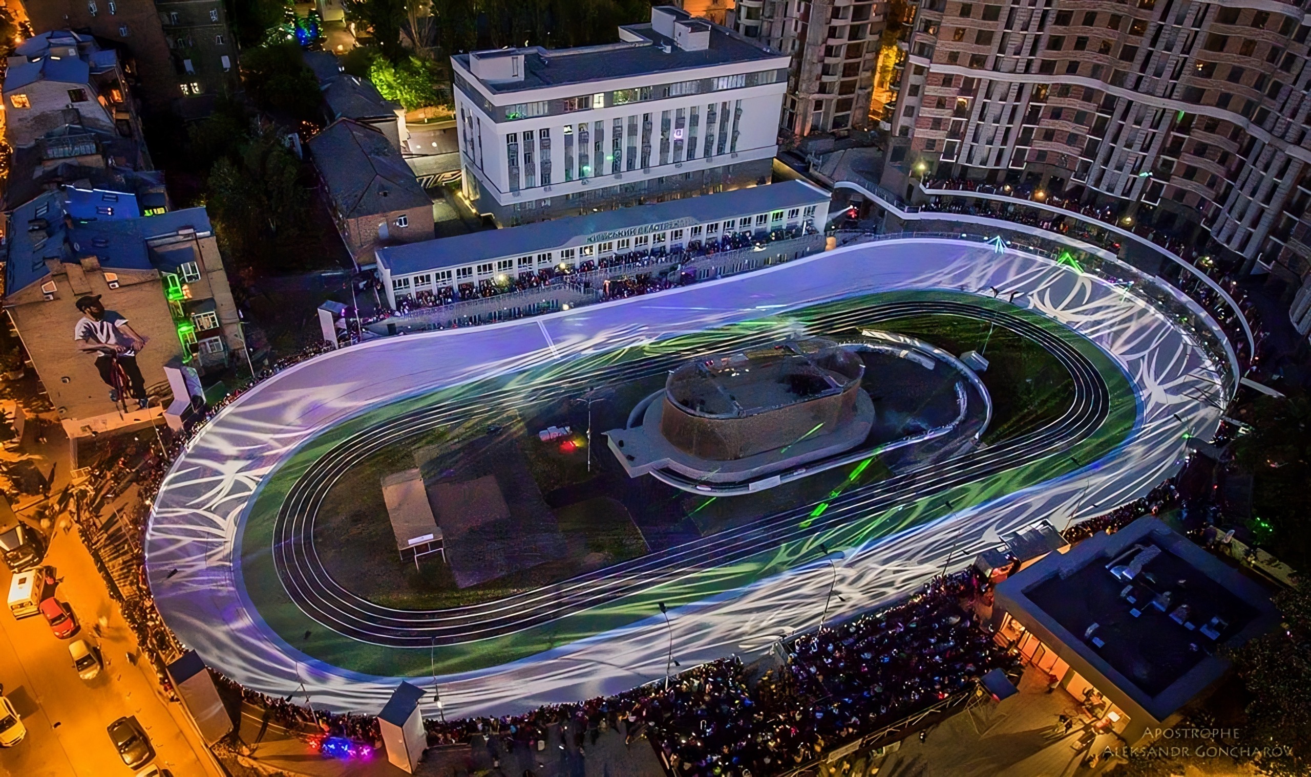 Lumotion Studio’s large-scale realtime projection mapping show for the Kyiv Cycle Track’s reopening combined light design, projection, and visual storytelling, transforming one of Kyiv’s most iconic sports venues into a cultural landmark. The event transformed the renovated track into a cultural stage, where architecture became a canvas for motion graphics, expressive animation, and synchronized stage visuals.